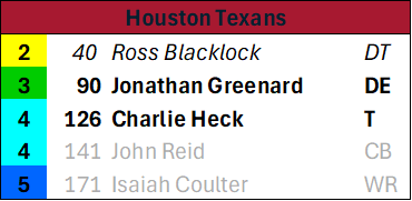 Analysis: Without a first-round pick from the Laremy Tunsil trade, and their own second from the Brandin Cooks trade, and getting one back in the DeAndre Hopkins trade, the Texans selected Ross Blacklock. Ranked a top 20 player, Blacklock barely cracked the starting roster his first two seasons, playing 25% and 47% of snaps, then was traded to the Vikings for a seventh-round pick before the 2022 season and only played 19% of snaps. He was cut before the 2023 season and spent time on the practice squads of the rest of the AFC South.
