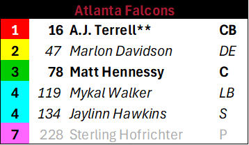 Two players that became starters that were surprisingly released in 2023 are Mykal Walker and Jaylinn Hawkins. Walker started 20 games in three years that included a 107-tackle 2022 season, but was released and caught on with the Steelers. Hawkins started 16 games in 2022, but lost the starting job following the signing of Jessie Bates and was released midseason then claimed by the Chargers.