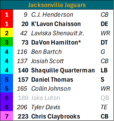 The next three players only lasted one year in Collin Johnson, Jake Luton, and Tyler Davis with all of them bouncing around different practice squads.