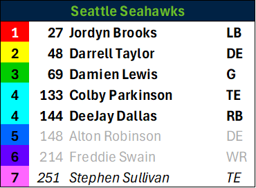 Damien Lewis was named the Week 1 starting guard as a rookie, and has held a starting job all four seasons with 61 career starts. Colby Parkinson has carved a nice role as a backup tight end with four career touchdowns. DeeJay Dallas has stuck around as a key player on offense and special teams his four seasons. Only two career starts, but Dallas is a proven solid backup and has been their primary punt and kick returner.