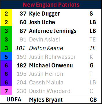 In an attempt to have production at tight end, two were selected in the third round, and both have had zero careers. Devin Asiasi had two catches with the team and only lasted two seasons before getting cut and has spent time with the Bengals and Browns. Dalton Keene had three catches as a rookie then missed his second season with injury before getting released, then spent time with the Eagles, Broncos, and Texans.