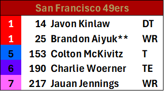 The 49ers were without second and third round picks from player trades the previous year. Dee Ford was acquired from the Chiefs for the second, and while he was a game wrecker in KC, the former first-rounder only played 18 games in three seasons after signing a massive five-year extension after the trade in 2019. The third-round pick was traded to the Broncos for wide receiver Emmanuel Sanders during the ’19 season and played a major role for them, but was not re-signed. So the players were good, their production…not so much.